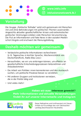 Die Gruppe „Politische Teilhabe" setzt sich gemeinsam mit Menschen mit und ohne Behinderungen mit politischen Themen auseinander. Angesichts aktueller gesellschaftlicher Krisen und extremistischer politischer Strömungen erleben viele Menschen Verunsicherung. Die Flut an Informationen und Fake News in den sozialen Medien schürt Ängste und erschwert die Meinungsbildung.