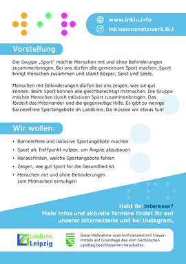 Menschen mit Behinderungen dürfen bei uns zeigen, was sie gut können. Beim Sport können alle gleichberechtigt mitmachen. Die Gruppe möchte Menschen durch inklusiven Sport zusammenbringen. Das fördert das Miteinander und die gegenseitige Hilfe. Es gibt zu wenige barrierefreie Sportangebote im Landkreis. Da müssen wir etwas tun!