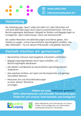 Die Arbeitsgruppe "Sport" engagiert sich dafür, dass Menschen mit und ohne Behinderungen durch Sport zusammenfinden. Unser Ziel ist es, Verständnis und Respekt füreinander zu fördern und Berührungsängste abzubauen. Sport schafft Begegnung und stärkt Körper, Geist und Seele.